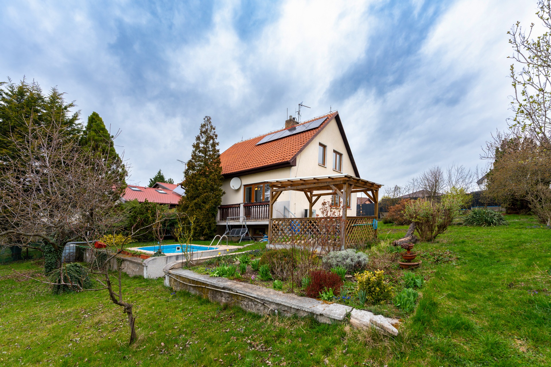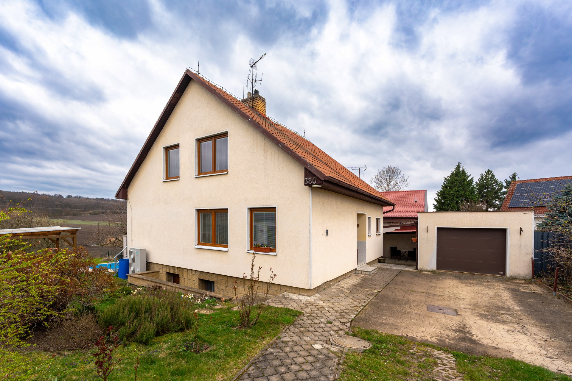 Hlavní průčelí domu je orientováno na jih, díky čemuž jsou obytné místnosti po celý den zalité přirozeným světlem. Součástí nemovitosti je samostatná garáž se sekčními vraty (22 m²), technický objekt na hraně pozemku (30 m²) a zahrada – vše v jedné ceně, včetně veškerého vybavení a příslušenství.